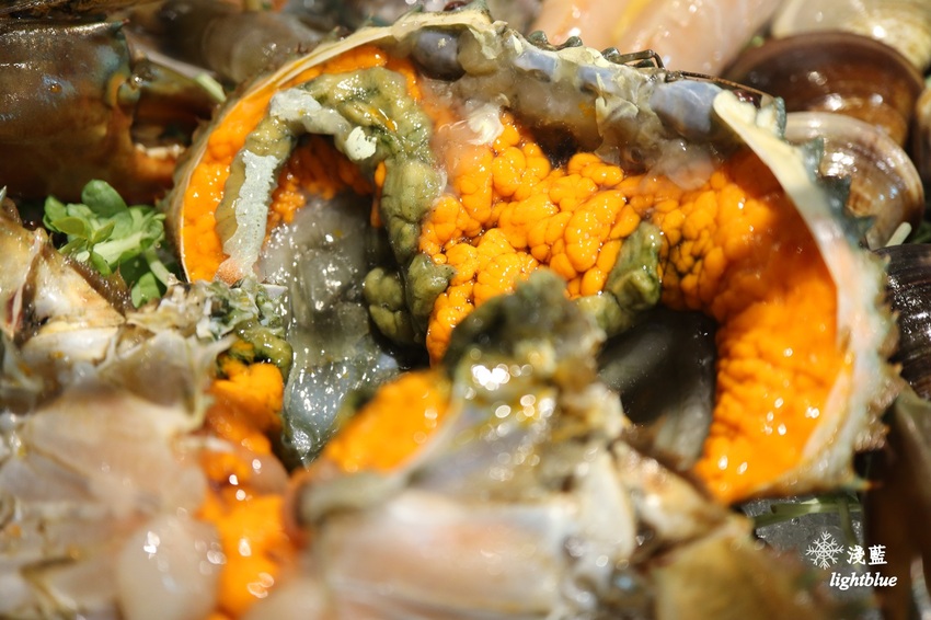 海鮮盤裡頭我第一眼看到的就是這隻活紅蟳,裡頭的卵未免也太驚人,整個滿出來!