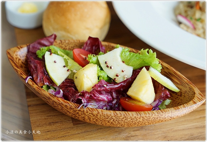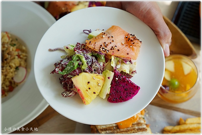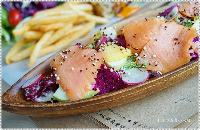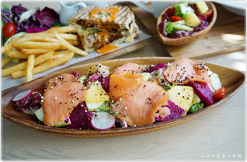 沙拉內有煙燻鮭魚、蘿蔓生菜以及當季生菜、櫻桃蘿蔔、火龍果、鳳梨等等