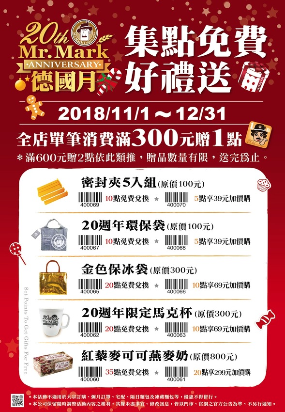 2018馬可先生德國月暨二十週年慶,還有集點贈好禮的活動,全店單筆購物滿300元就贈送一點,最低集滿5點就可以加購了,詳細說明可以到官網詳閱、或參考門市相關資訊:https://goo.gl/vUyMM8
