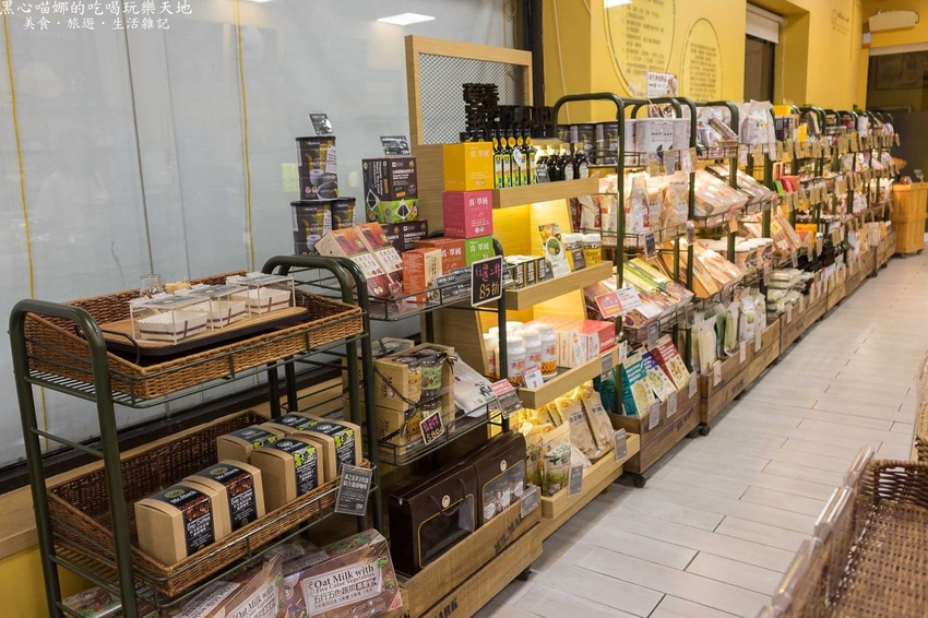 牆邊架上為營養超市區,擺放著雜糧餅乾…等零食、以及麥片、濾掛咖啡、茶包、油品、楓糖…等產品。