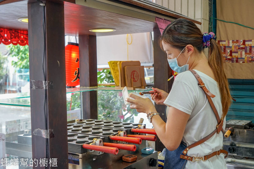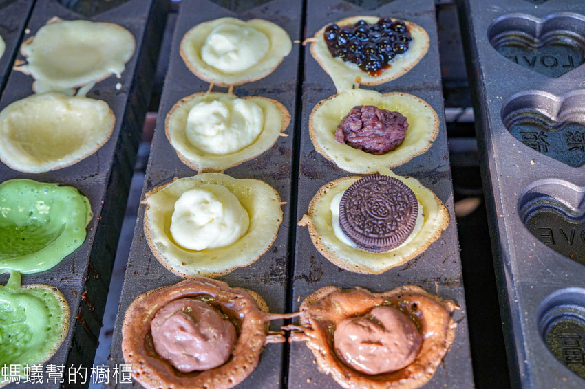 點單後,看著闆娘流利的動作燒烤著樂福燒,模具上方先塗上薄薄一層奶油,倒入麵糊,不時還要輕輕攪拌麵糊,讓裡面均勻受熱,吃起來口感更蓬鬆!接著在擺上各種不同配料組合。
