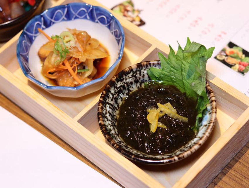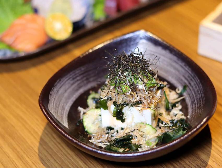 在海苔絲及豆腐之間,堆了許多的吻仔魚。炸過的吻仔魚香酥可口,與軟嫩的豆腐有著微妙的平衡。搭配一旁的小黃瓜及海帶,帶來口感層次上的變化。