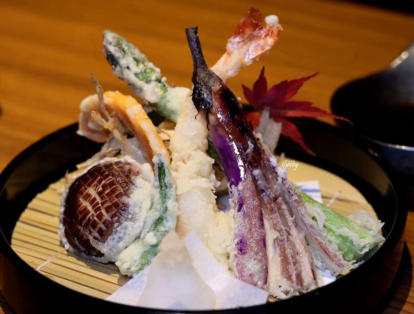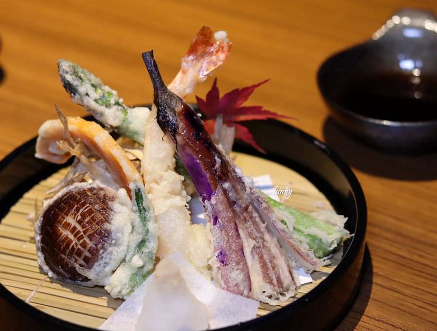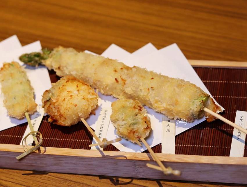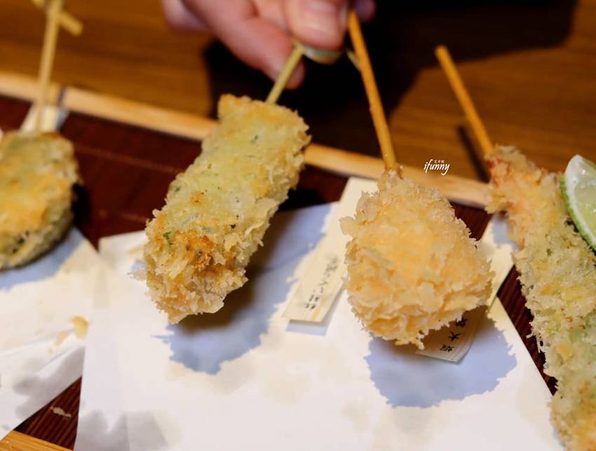可以看出這些串炸外面的麵衣是很薄的,而且擅用紫蘇葉包覆食材再裹粉去炸,紫蘇葉隔絕了油脂,如此食材吃到口中不會油感很重,而且帶著紫蘇的香氣,這真的是很不錯的作法。