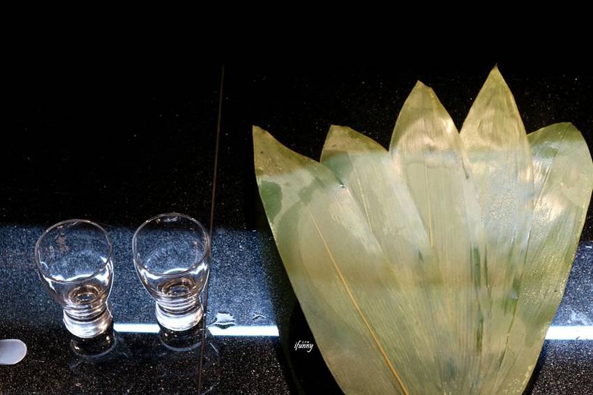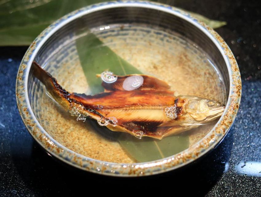 再以葉子燜三分鐘後,讓酒味與香魚緊密結合。