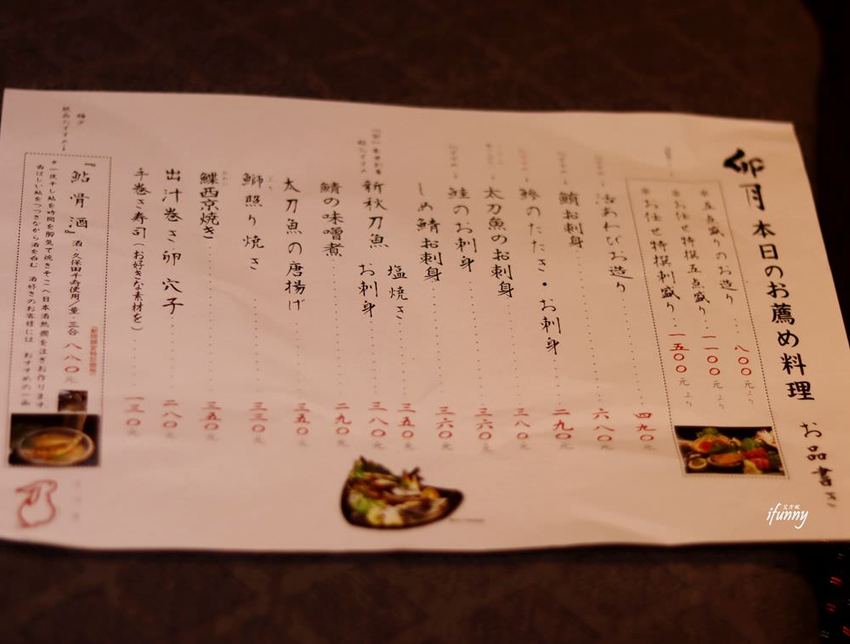 呑み処 卯月外觀十分素雅,靠近門口的包廂採用毛玻璃,透過燈光可見到座位與人影流動,還有簡單的菜單放置門口,平實的價錢降低了疏離感,是一家很容易親近的居酒屋。