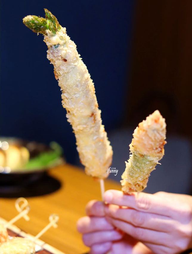 瞧這支蘆筍比其一旁的蝦紫蘇串炸大上好多喔!原本以為這麼大隻的蘆筍,肯定纖維很多不好咬,沒想到這蘆筍細緻、多汁且香甜,令我們讚不絕口呢!