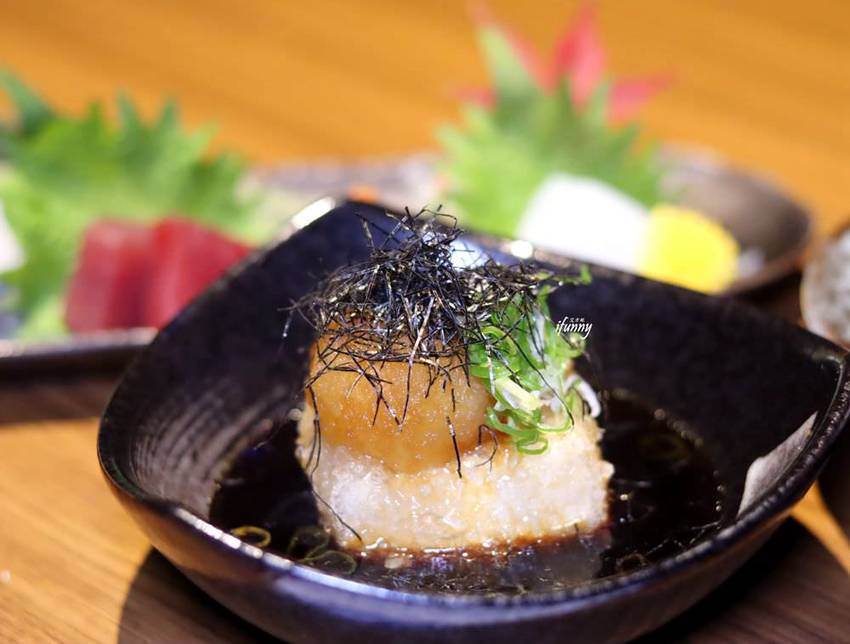 炸過的豆腐浸在特製的醬汁中,其上飾以蘿蔔泥及海苔絲。炸過的外皮吸附了醬汁,和上蘿蔔泥,簡單吃出豆腐的香味。