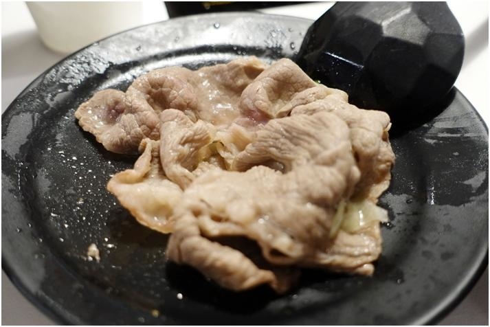 第一次看到肉片切的這麼大片的,肩背肉的特徵就是中間會有一條很明顯的分隔,有霜狀的油花和大理石紋的油花.大片的是美國和牛,是美國安格斯牛和日本和牛的混種.吃起來很像在吃牛排,肉味比較重我自己沒那麼喜歡.