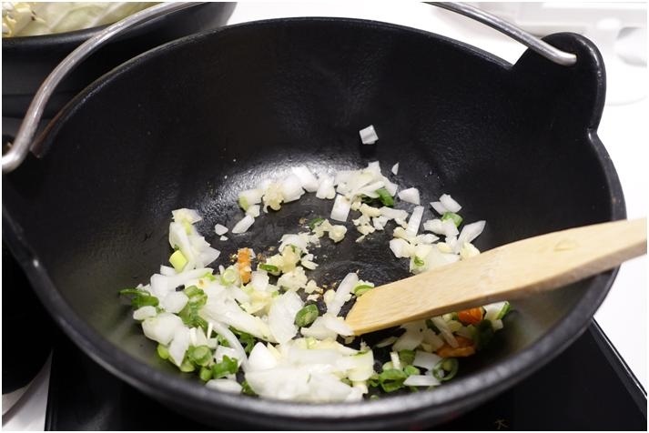 先將電磁爐開中火約30~40秒熱鍋.之後把上面這些佐料放進去快速地翻炒30秒,記得要很快地翻動喔不然會黏鍋底等等湯頭會苦苦的.很快地就可以聞到香味,這時候就可以把旁邊的高湯全部倒進鍋子哩!.炒過的佐料和高湯聞起來就像是傳統的石頭火鍋!這個做法不僅增加了用餐的趣味,也讓湯頭比外面的火鍋高湯滋味更豐富!