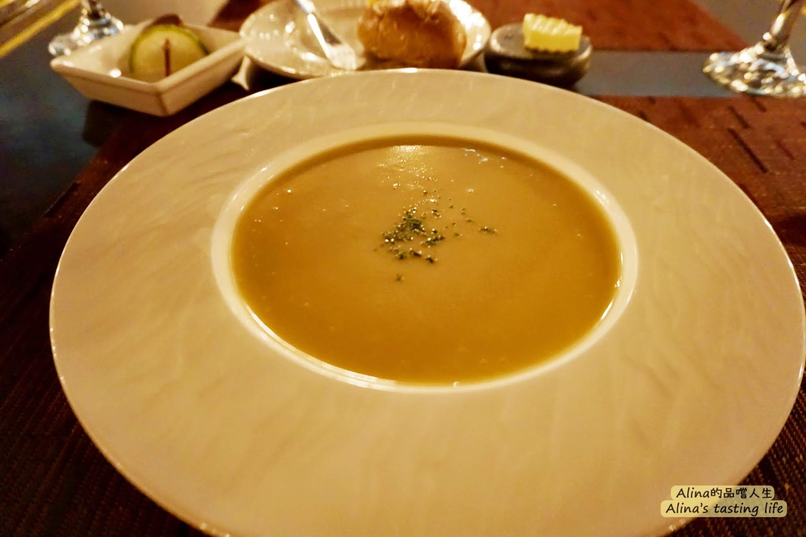 一開始我真的是低估法國菜的量了,我一直覺得就是東西少少的幾口就吃完,所以帶著一個沒有餓沒有飽的胃來這裏,結果一開始給我這些麵包啦~這三個小麵包的量就差不多是我的早餐的量啊哈哈哈哈,真是神奇,早餐可以吃這麼少,晚餐這些不過是當前奏墊墊胃用的~