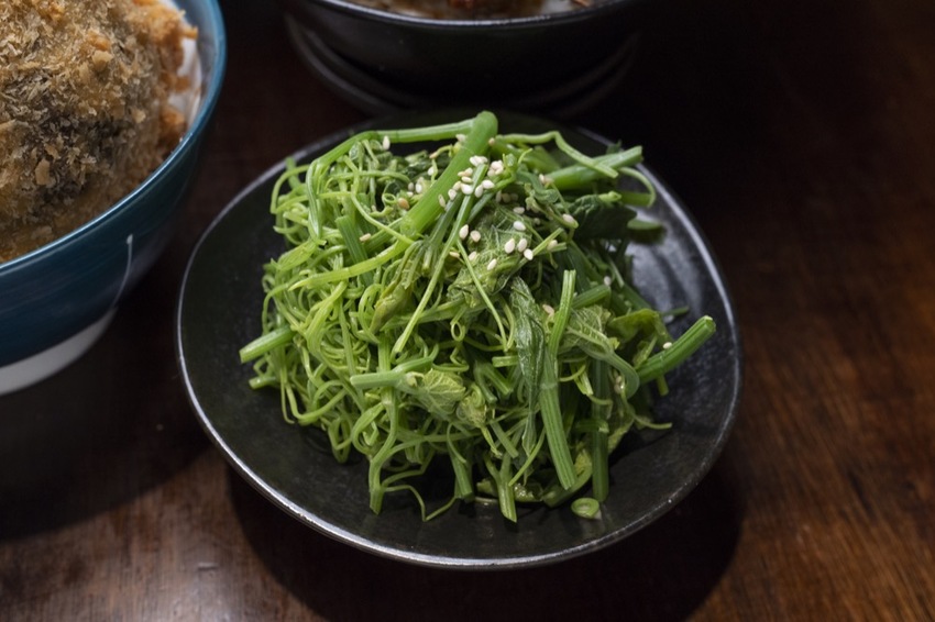 一口雞肉一口蛋,把整碗的飯都吃光光~搭配涼拌時蔬:龍鬚菜的脆度十足,吃起來很清爽~