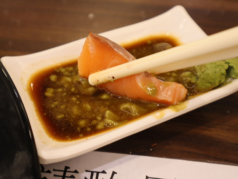 這盤送上的生魚片是鮭魚,以單人分計約六片~吃完就在去夾夾子就可以~