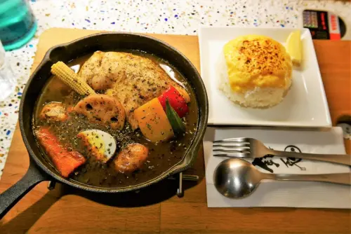 所謂的湯咖哩發源自日本北海道,和一般有著濃稠醬汁的咖哩不同。湯咖哩是可以喝的咖哩,裡面除了肉類或海鮮外還會加入大量的蔬菜,像是馬鈴薯、紅蘿蔔、菇類、茄子、玉米等等,豐富又好吃喔!