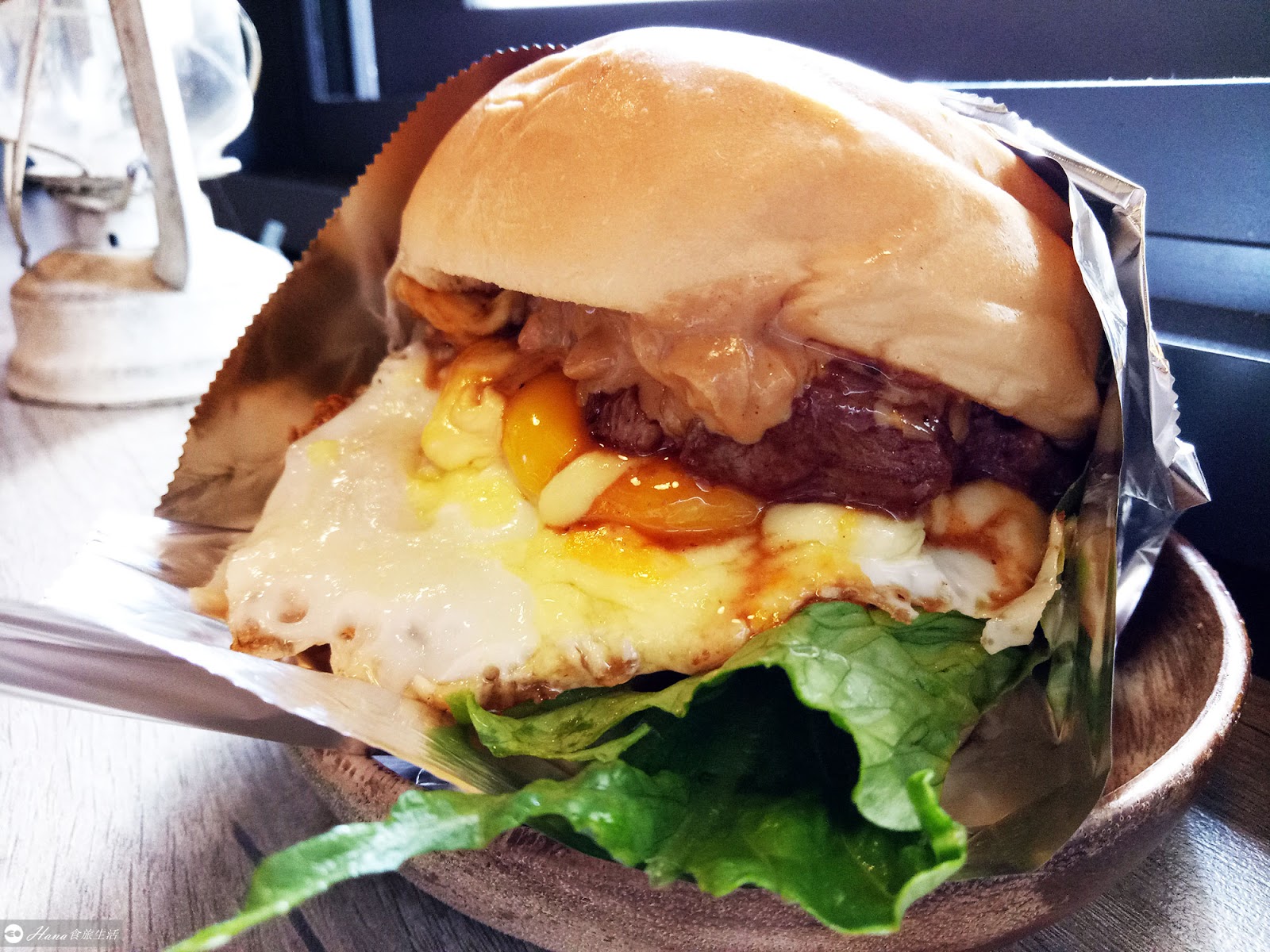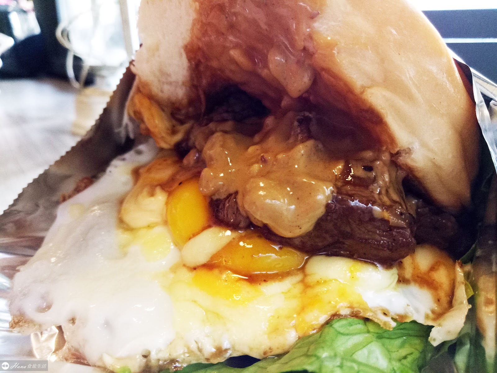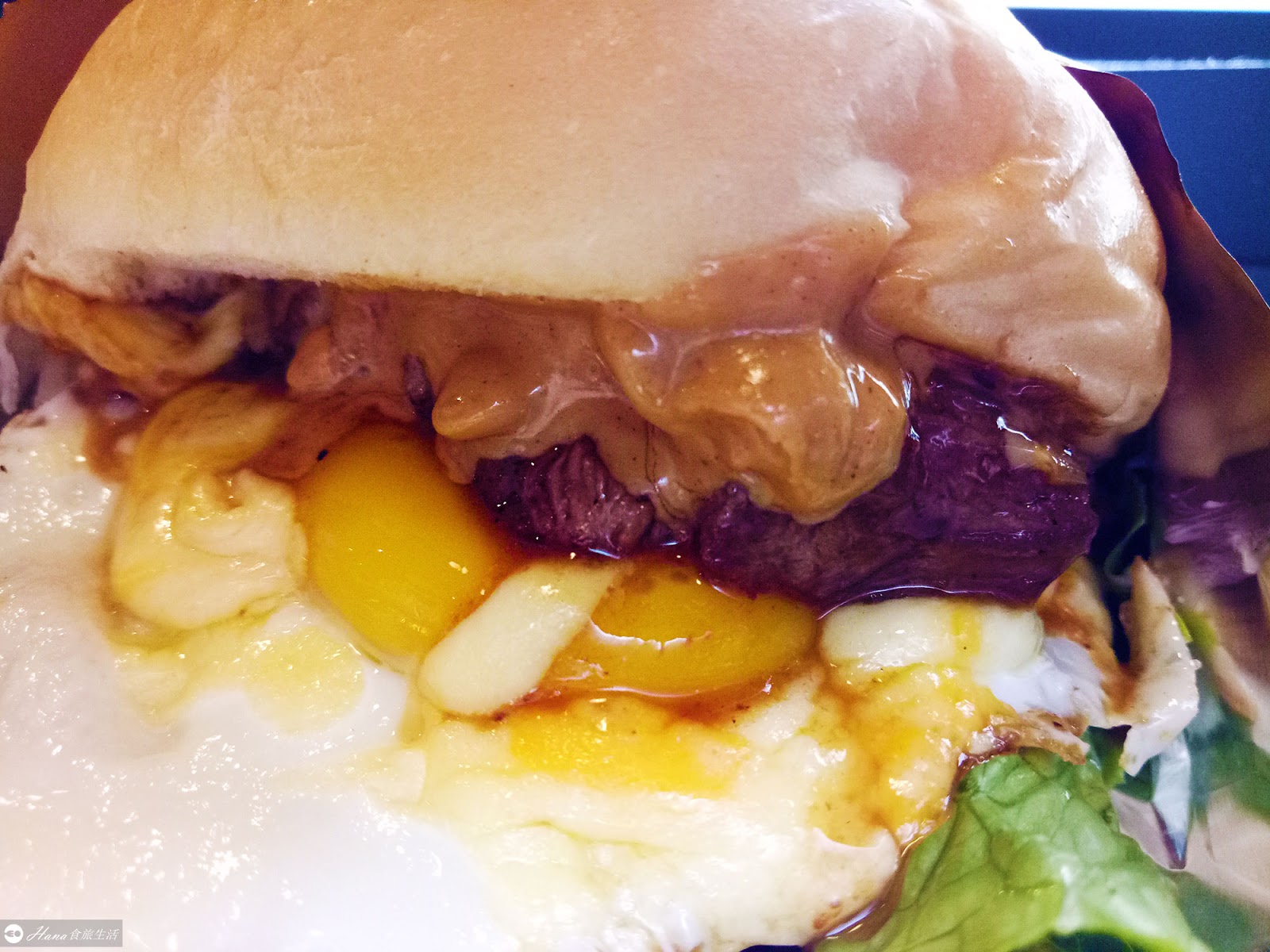 首先看到被牛排擠壓的半熟蛋黃和塗出來的花生醬,