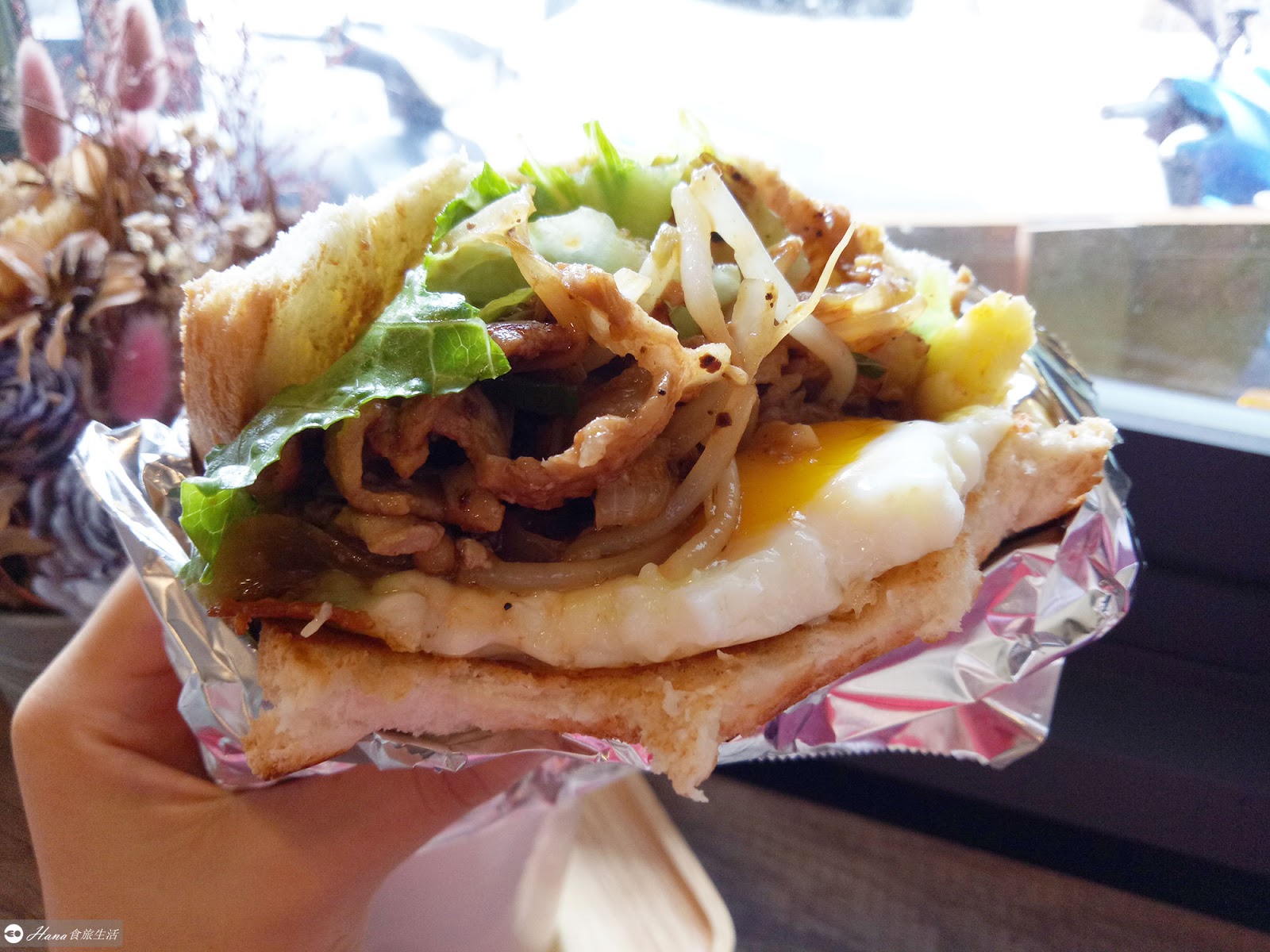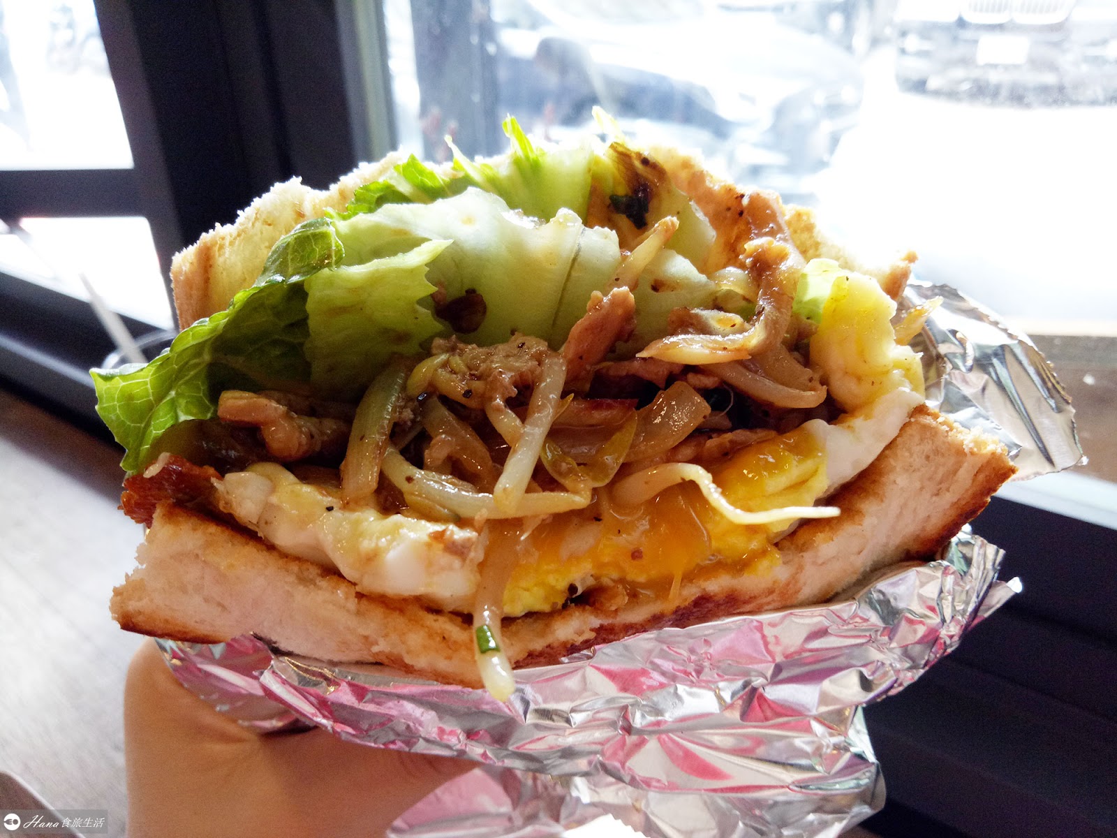 兩片大吐司中間夾豬肉炒豆芽菜、蛋、起司、洋蔥、蔥花和生菜