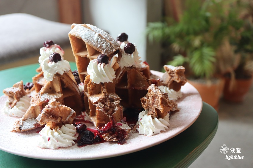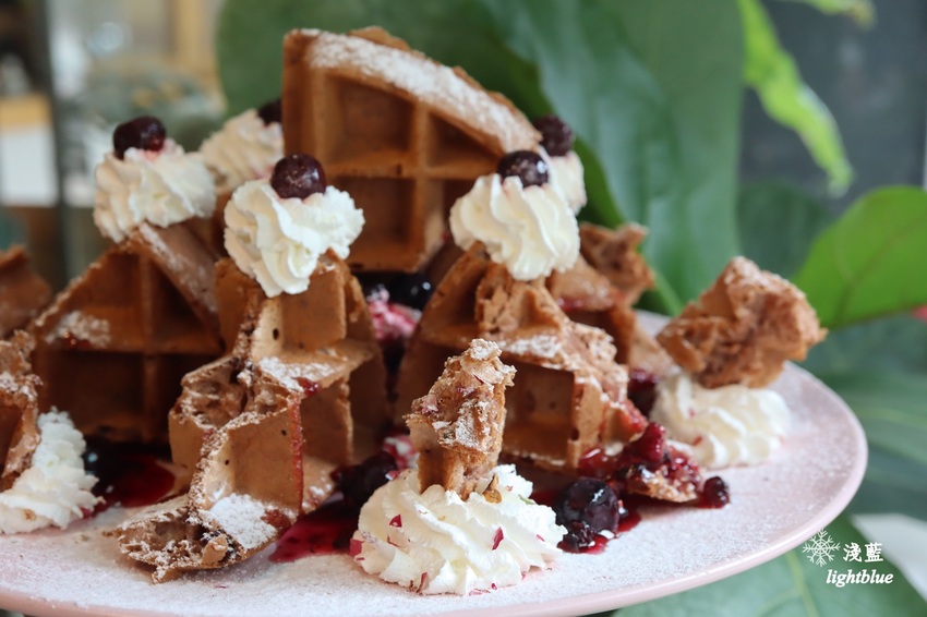 午茶鬆餅以初鹿鮮乳製作,不同口味還會有不同的擺盤方法,這盤是酸甜莓果花香