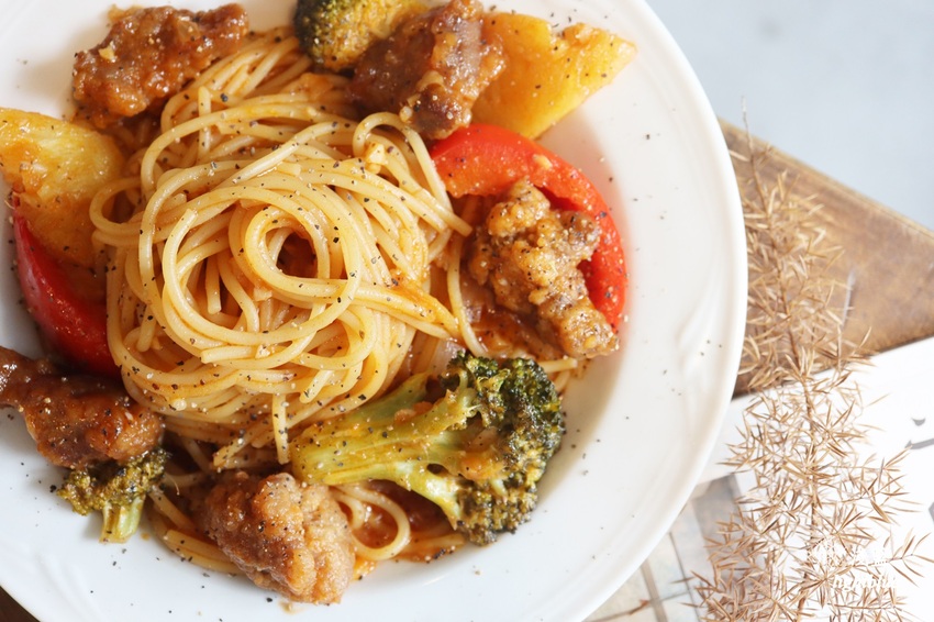 糖醋排骨果香義大利麵使用自家手工熬煮鳳梨糖與拉拉山水蜜桃醋搭配蕃茄醬,酸酸甜甜的糖醋醬豐富了整道料理,卻沒有過度的調味,讓醬汁完全巴附在麵條和排骨上頭,形塑出一口接一口的開胃美味。