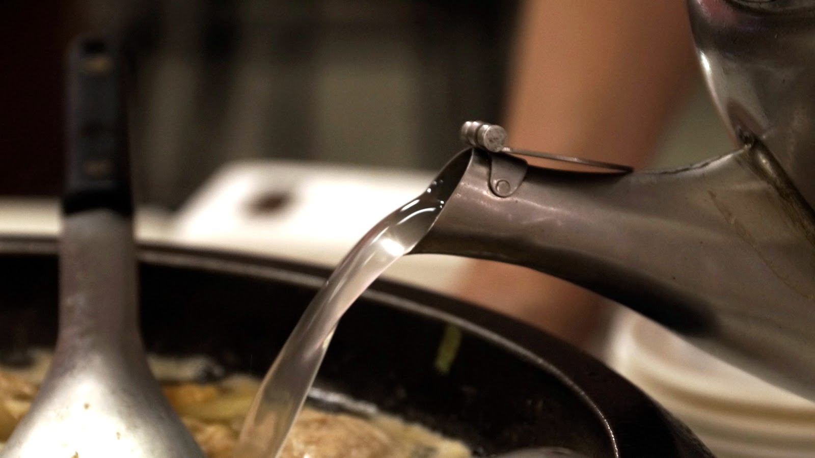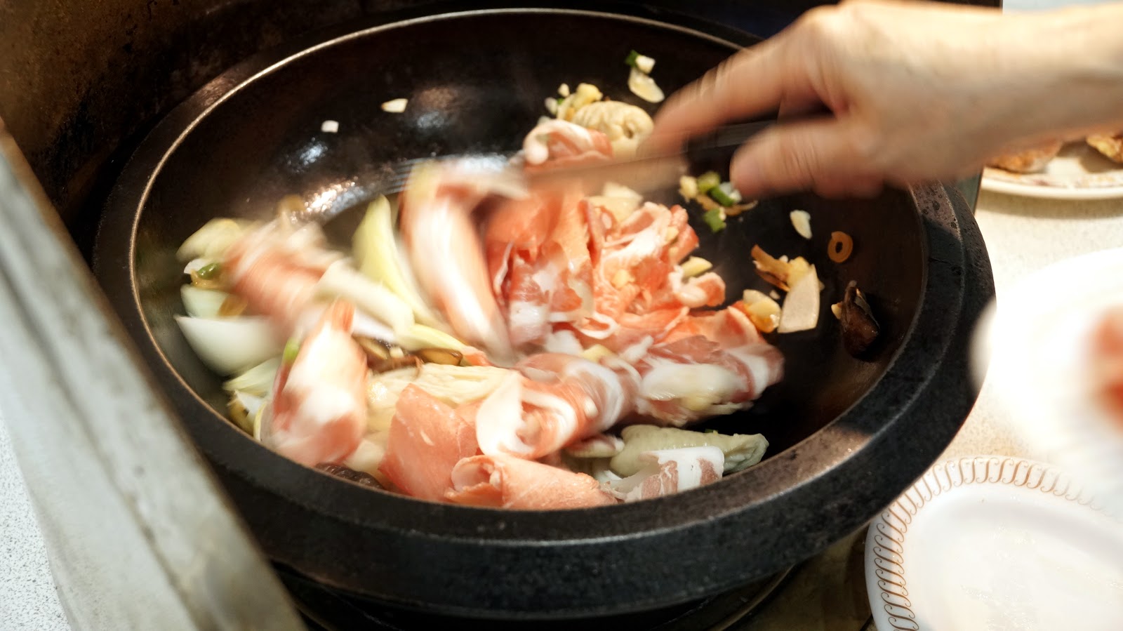 既然店名是真味石頭火鍋,當然少不了一招先爆香炒肉後加入高湯的表演秀。相當特別的是這裡爆香的過程,他會加入魷魚乾絲與香菇。而且恰好我們拿了一盤肥腸,老闆在爆香的過程也順便幫加下去爆香增加那種脂肪與膠質乾煸的氣味。關於石頭火鍋的爆香也分好幾個流派、有的爆完會直接把湯倒下去一起滾、這邊則是爆香時會在肉的熟度大概八分程度就撈起來。