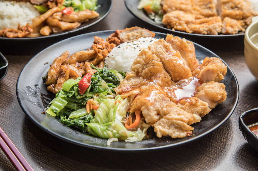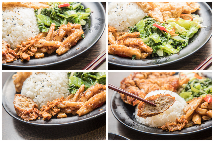 黃金嫩雞飯可以說是小朋友的最愛!使用超厚實新鮮雞胸肉,每天都要手工現剖,再沾上薄粉漿下鍋油炸,外皮看起來金黃酥脆,起鍋再淋上甜雞醬