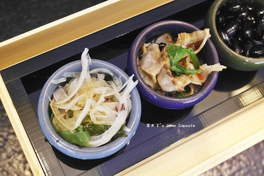 當天四碟小菜分別是百香南瓜、蜜漬黑豆、干貝唇拌龍鬚菜、涼拌洋蔥海藻,