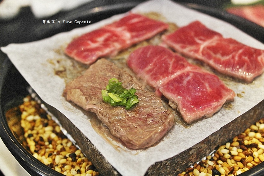 高熱的石板和精選的牛肉並附上了玫瑰鹽和蔥鹽,