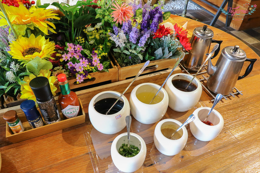 吧檯旁和中間花叢桌面,分別有飲用水和火鍋醬料、加湯,皆採自助方式,有需要請到這裡自取,飲用水是每日新鮮切片的葡萄柚柳橙水,帶點自然微香甜,喝起來格外清爽