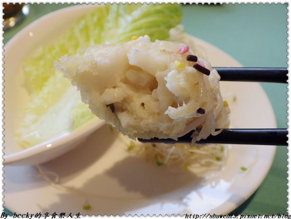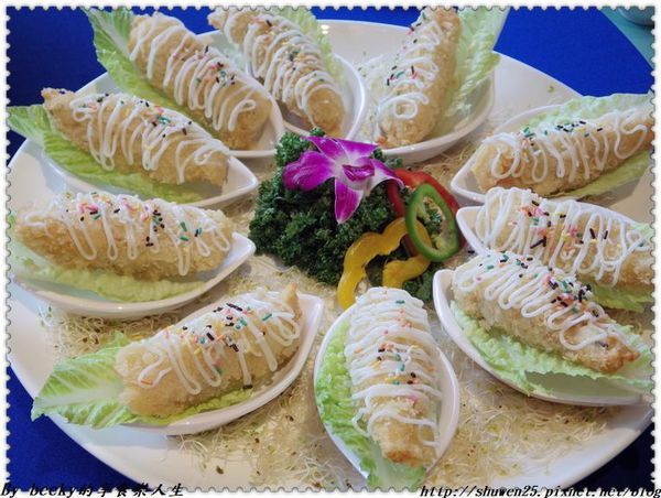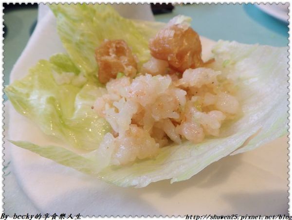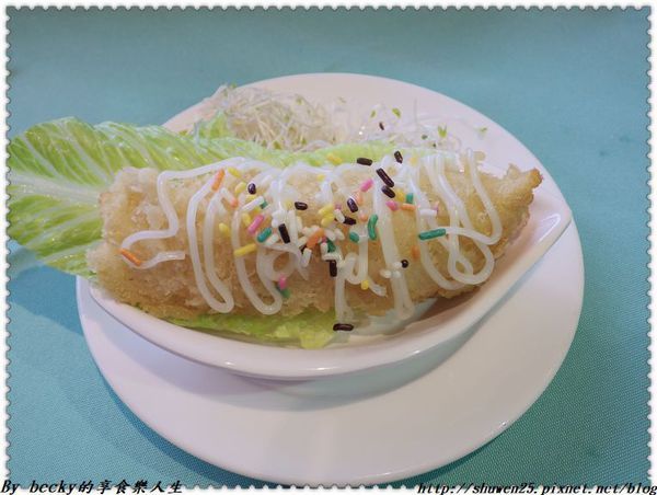 新鮮的蘿蔓生菜清脆帶著水份,外皮的麵衣炸的酥脆,裡頭內餡很豐盛,有Q彈的花枝、與蝦魚漿及不同口感的蘋果丁及荸薺,咬一口與上頭的美乃滋融合,酥脆香濃好味道~不過我的竟然連蝦子尾巴都沒吃到(真是太不幸運了