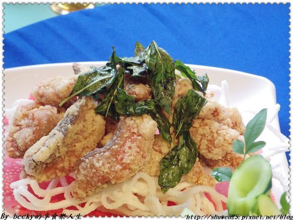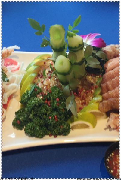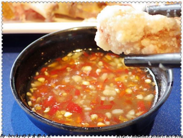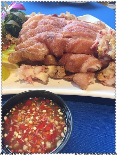 而鰻魚也是酥炸過~先用紅麴醃漬過,還去酥炸,吃起來酥脆香外皮及鰻魚肉鮮嫰,入口有著淡淡紅麴味,沾著泰式醬汁,有著酸甜微辣感,非常對味好吃!