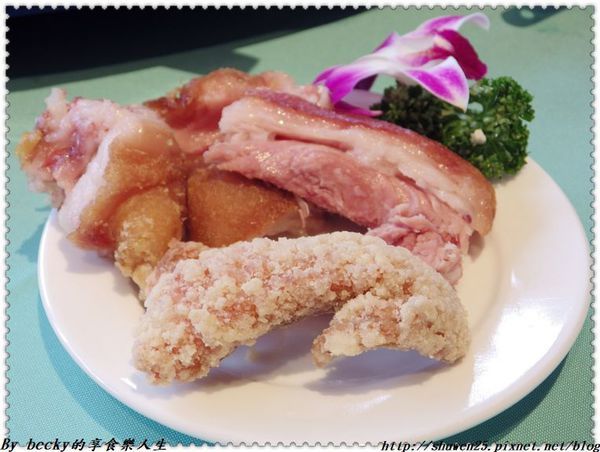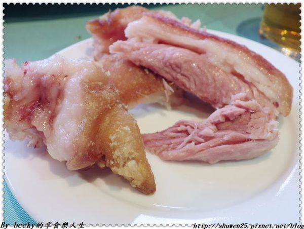 豬腳是先蒸後炸多重的繁複手續,且豬腳還要先醃漬2天,所以整個外皮酥脆不油膩,而肉質軟嫩,入口還帶有肉汁,肥而不膩。