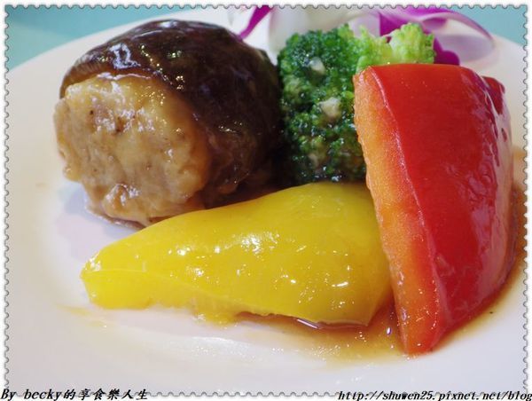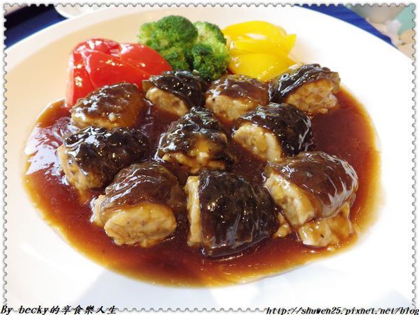 這個是烏參包覆著蝦漿及魚漿製成的絞肉,裡頭還有清脆口感的荸薺,旁邊有著甜椒及花椰菜陪稱,整個非常鮮明。