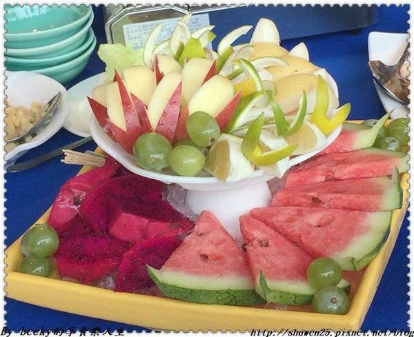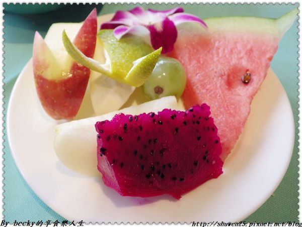 飯後就是水果~這盤水果非常精緻及多樣,裡頭有紅火龍果、西瓜、蘋果、葡萄、柳丁及梨子,擺盤也很吸引人的目光。