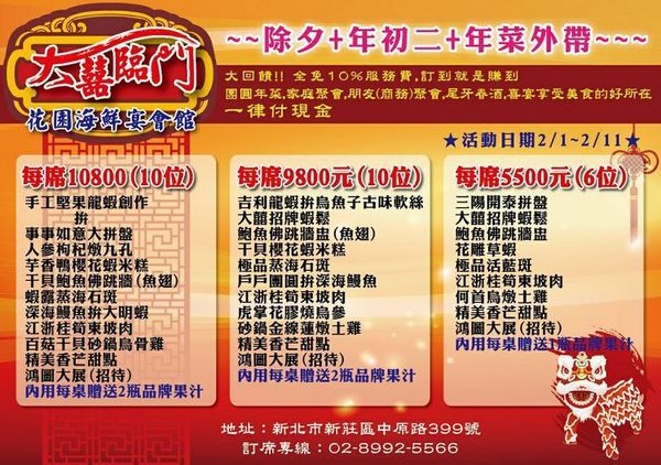 對了~大囍臨門花園海鮮會館現在起有尾牙及年菜預定,喜歡海鮮或要預購年菜的朋友,可以參考一下菜單~