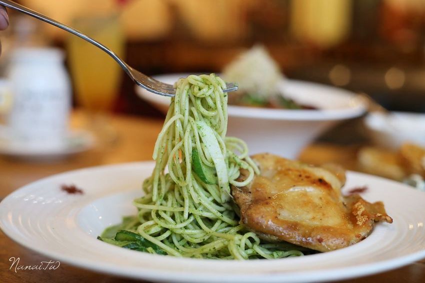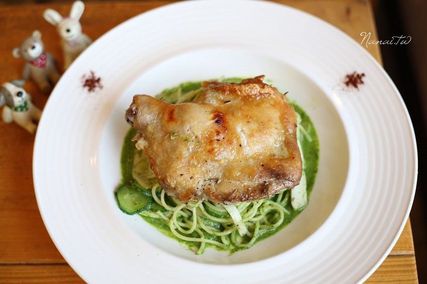 這道香草雞腿排青醬義大利麵的醬汁與雞肉也都是自己製作,以整隻雞腿醃製後製烤,烤到外皮微微焦香,再搭配CamPania坎佩尼亞的義大利麵與自家熬煮的青醬調味,這道組合也是十分豐富!