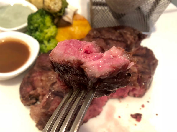 可以看到牛排切開後,呈現粉紅色的肉,是選擇七分熟,沒有過多的血水,