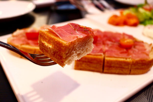 法國麵包本身沒有很特別的味道,只有麥香,所以搭配風乾火腿,有特殊的味道,微鹹的開胃小點,