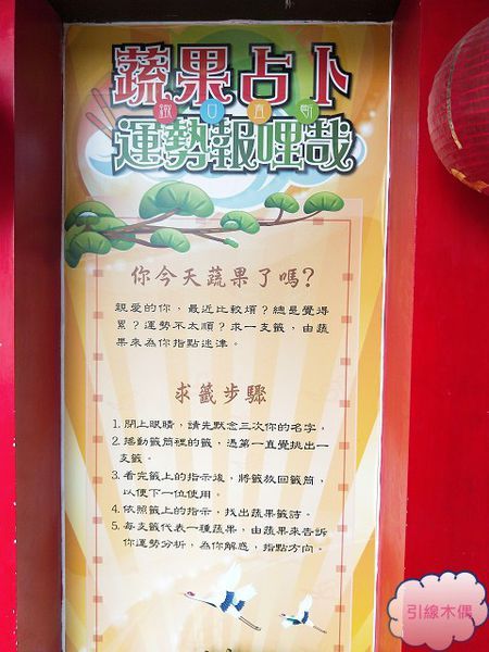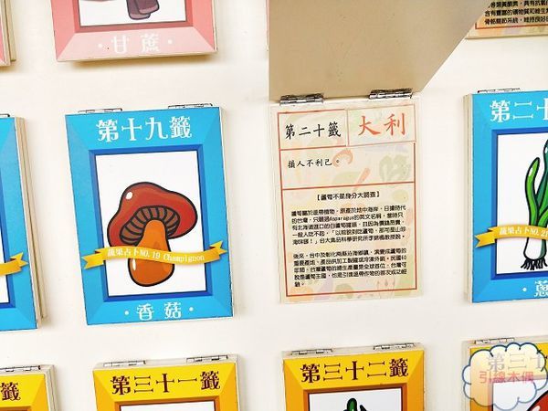 一整面牆七十二隻籤以及一個大籤筒,每個籤對應不同的蔬果,愛吃信女木偶立刻帶著一顆純淨良知的心,誠意相求蔬果大神給予指引嘿~