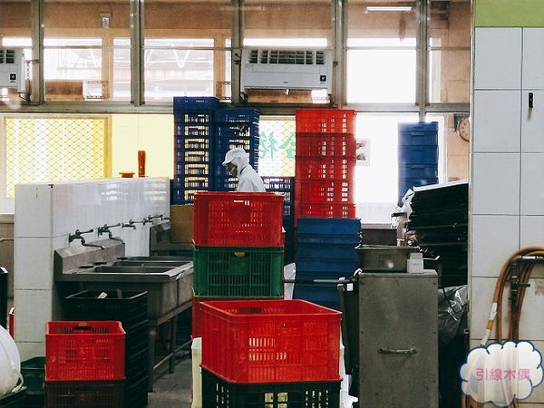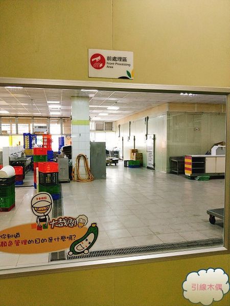 寬敞的前處理區,洗滌的非常乾淨明亮。三個水槽作三次洗滌,確保食材的潔淨衛生。以最單純的顏色分類食材、食物籃子,增加品管安全正確率,降低Near Miss的可能性。