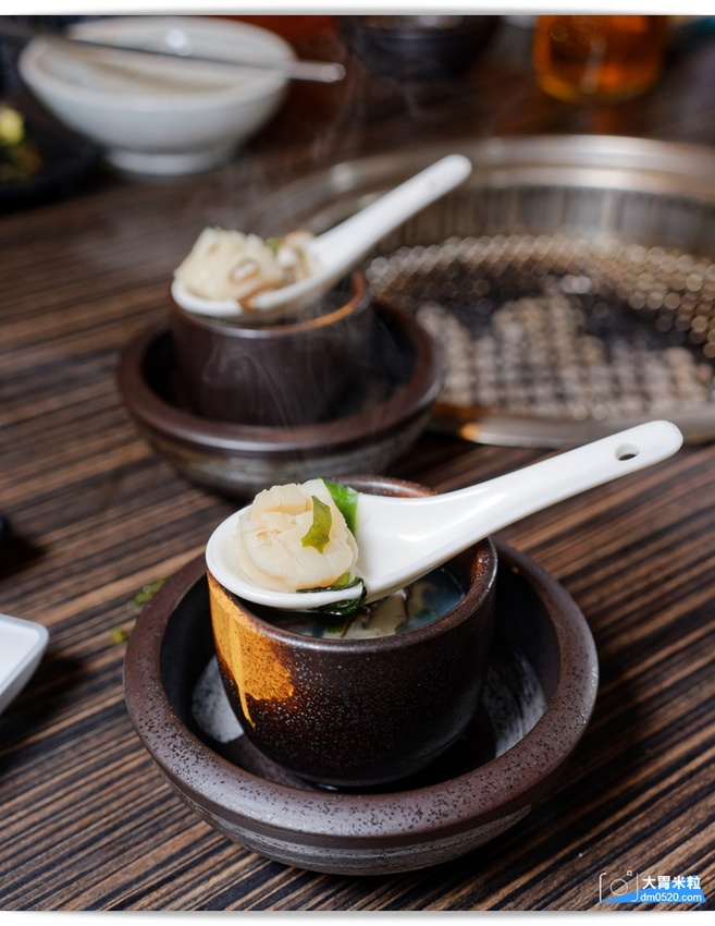 燒肉吃飽後,師傅準備將生食級干貝放入陶杯內,