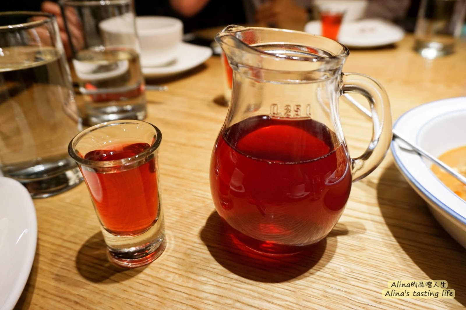 雖說沒有飲料,但是有這個開胃果醋可以無限喝!我們猛喝這個,一口小杯實在是太少了,因為太好喝一直到,一群人一下就喝光,但服務生又補得很慢啊~為啥不一次給大一點的瓶子勒