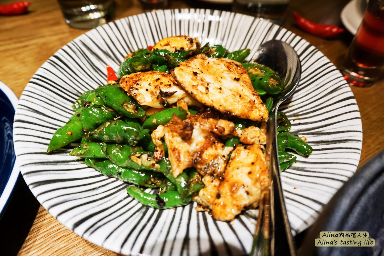 綠色的不是豆子也不是青椒,是一點都不辣的糯米椒,聞起來有香吃起來不辣喔~放心放心