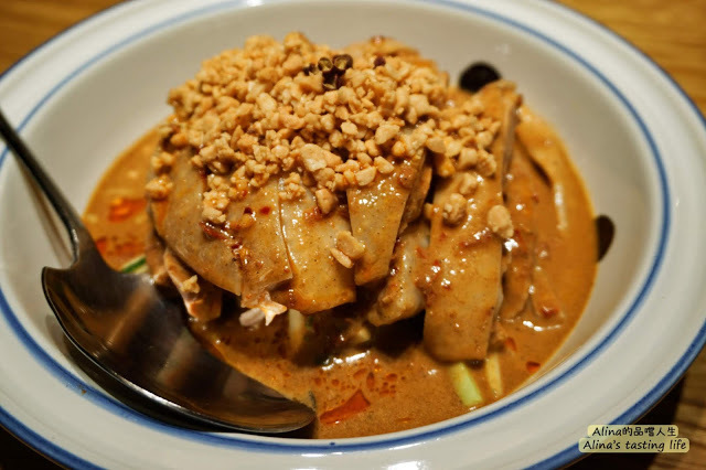 帶皮的雞肉,肉質扎實,冰的更讓雞皮彈嫩像是凍狀一樣,下面還有小黃瓜增加口感,麻醬調味香醇濃郁,均勻的沾在鮮嫩的雞肉上讓人上癮!