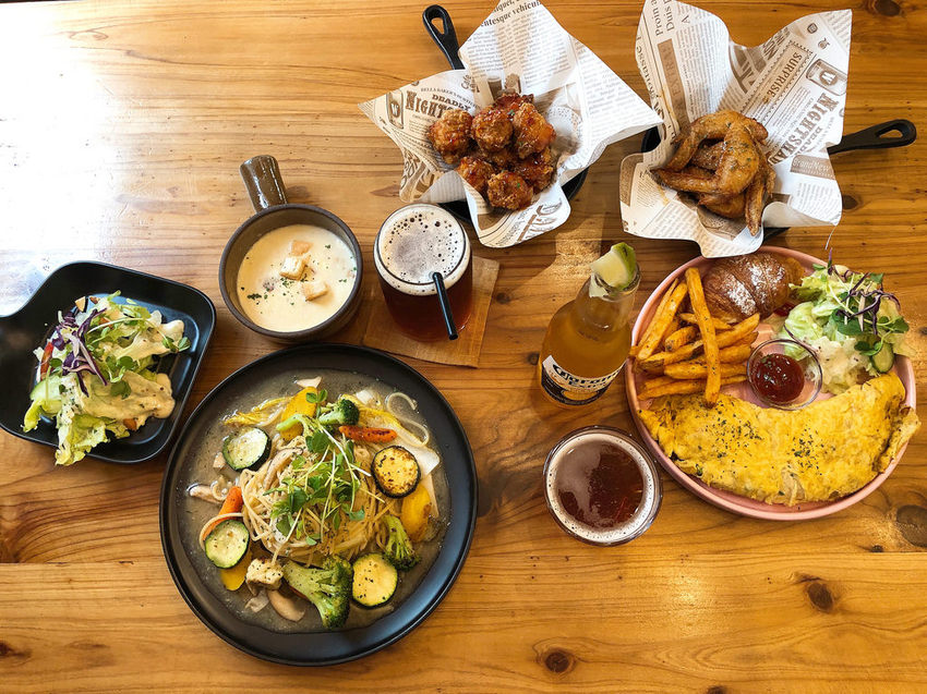 酥炸雞腿塊(酸甜醬)+醃漬炸雞翅(蒜香蜂蜜)+南洋老家打拋豬歐姆雷+纖女食蔬義大利麵(套餐)+可樂娜啤酒