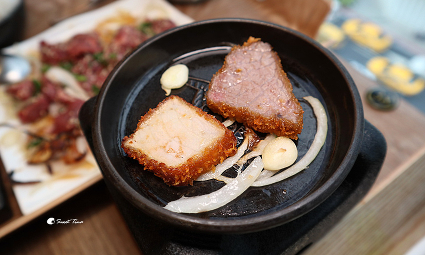 這次與大家分享的餐點有「炸冷藏黑牛霜降+炸南方黑鮪魚上肉雙拼」+88升級套餐、「蒜香甜洋蔥牛燒肉」+升級飲品、+88「玫瑰豚霜降」。