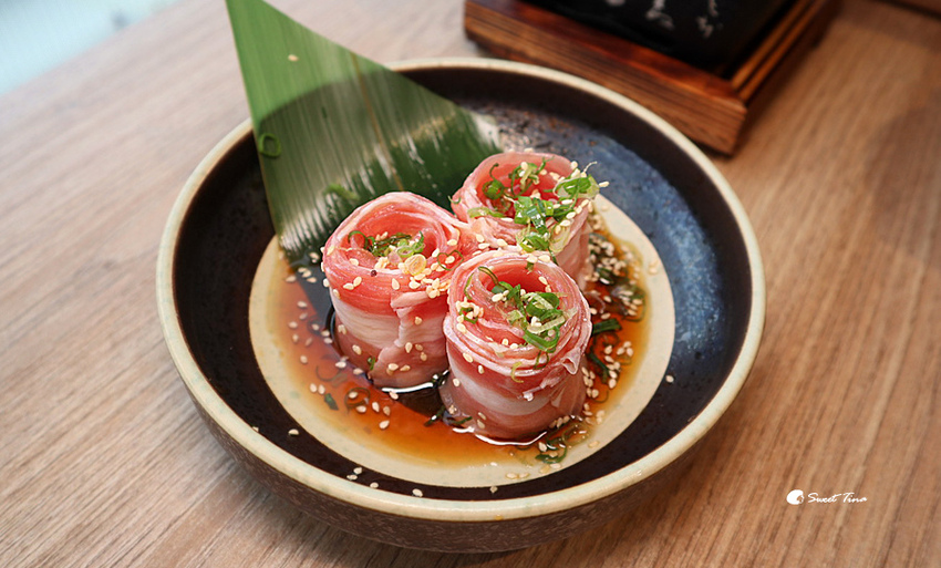 炸南方黑鮪魚上肉是屬於生食級的,所以直接食用也很OK的喔,魚肉的本身就有調味,不用沾醬直接品嚐即可。