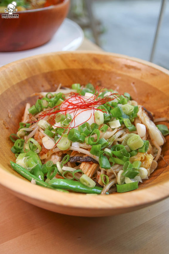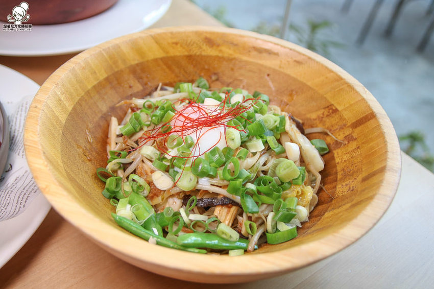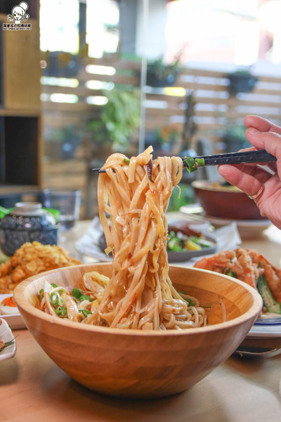 帶有中式料理的麵食,使用木盆裝好有質感