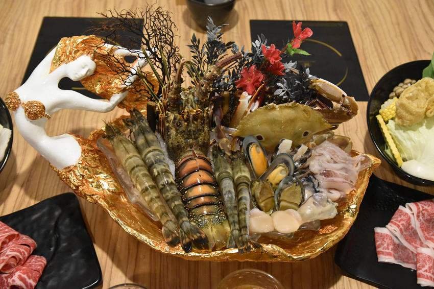 我們點的雙人套餐可不是只有兩盤頂級肉肉,還有一盤超浮誇的海鮮盤,看那氣派又華麗的美人魚造型餐盤上排滿了各種海鮮,這道海鮮拼盤裡面的食材有龍蝦、螃蟹、烏賊、草蝦明蝦和各種高級貝類,每一種食材都很新鮮,吃起來鮮甜又美味,干貝和生蠔煮過之後肉質很飽滿,鮮美又超多汁
