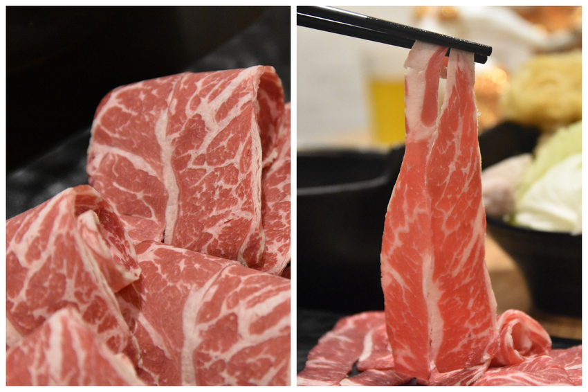 薄切的牛肉片涮個五分熟就很好吃了,這兩種牛肉的香氣跟肉質都是一等一的美味,牛小排因為帶有恰好比例的油花,所以吃起來軟嫩中帶著一點嚼勁,日本老饕豐厚的油脂與細緻密集的油花分布,煮過之後更是香氣十足,雖然脂肪肥美但卻不膩口,入口後肉質柔軟又很滑嫩,讓人吃得非常滿足