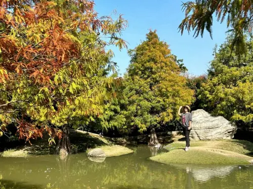 園內有著如同小山丘般的高底起伏設計,再配上波光粼粼的湖水以及落羽松的點綴,