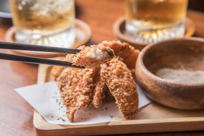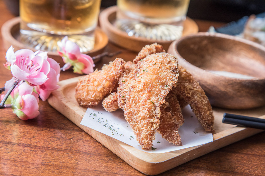 喝酒當然要來點下酒小菜囉,大村武串燒居酒屋-大安店除了一些店內獨特的看板料理外,不時也會推出新的菜色,咬咬還蠻推薦這裡的炸物的,山葵椒鹽酥炸鮮魚算是點播率相當高的一道炸物,乍看之下還蠻像炸雞翅膀的,是使用鮮魚塊沾粉下鍋油炸,佐以山葵椒鹽