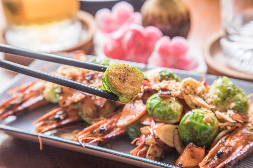 無敵蝦到爆還加了一個很奇特的食材:小甘藍,國內並不少見,咬咬曾在美國吃過烤的,微微的苦甘帶有層次脆度口感很特別,這裡則是與蝦大火爆炒,小甘藍吸收了蝦甜味及清酒的香氣,外表沾附了蒜酥,水嫩爽脆的口感中還有蒜酥的香氣,一口甘藍一口酒,幸福!